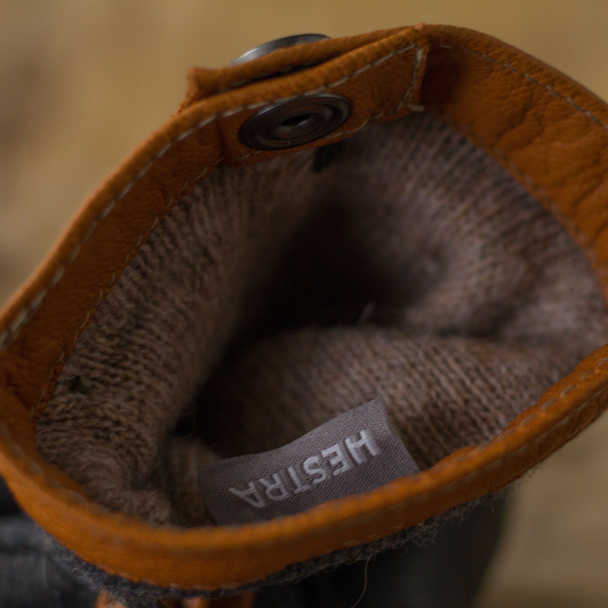 Die Handschuhunterseite ist aus Hirschleder. Die Oberseite des Handschuhs besteht aus Wolltrikot mit warmem Wollfutter. Pflanzlich gegerbtes Ziegenleder findest du an dem Bund.