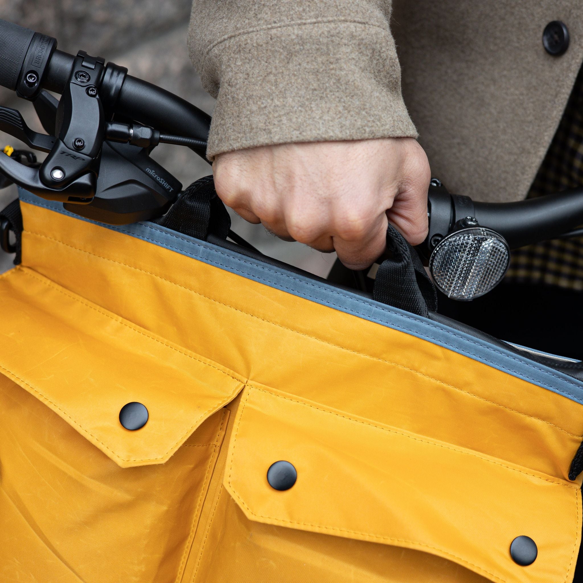 Um die Zoe Bike Bag am Brompton Fahrrad zu befestigen, benötigen Sie den zusätzlichen Rahmen. Der Rahmen gleitet in die Rückseite der Zoe und kann dann in den Brompton-Taschenhalter eingeklickt werden.
